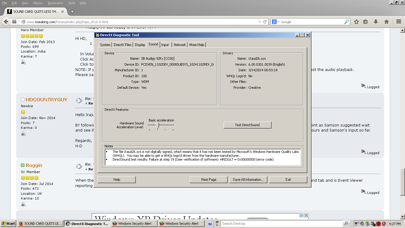 You may have to contact Creative for advice in obtaining a WHQL XP driver or one that is verified and make a note of what that error message says.