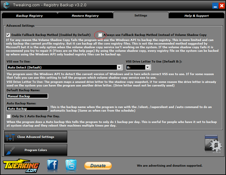I am a new user to Tweaking.com registry backup . When I back up the program only backs up 12/14 registry items and uses the Backup method.  Just below the backup button  I see  that " Volume Shadow copy not running"  Cant figure out what is wrong. Please see attachment .