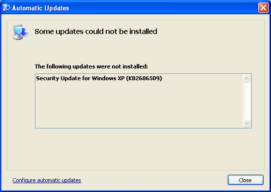 I found this in your logQuote13.282: 2012/10/03 03:53:19.328 (local)13.328: C:\WINDOWS\SoftwareDistribution\Download\3438087687b5dd8accc81e44f72f02e7\update\update.exe (version 6.3.13.0)13.438: DoInstallation: GetProcAddress(InitializeCustomizationDLL) Returned: 0x7f 13.438: Failed To Enable SE_SHUTDOWN_PRIVILEGE13.469: Hotfix started with following command line: -q -z -er /ParentInfo:6a20991e19826d40ab0623d9725c4007 13.516: In Function GetReleaseSet, line 1240, RegQueryValueEx failed with error 0x217.000: Return Value From IsMachineSafe = 017.000: IsMachineSafe returned 44109217.000: Fist Condition in Prereq.IsMachineSafe.Section Failed17.000: Condition Check for Line 1 of PreRequisite returned FALSE 17.016: ReadStringFromInf: UpdSpGetLineText failed: 0xe000010217.016: KB2686509 Setup encountered an error: Setup cannot continue because one or more prerequisites required to install KB2686509 failed. For More details check the Log File c:\windows\KB2686509.log17.032: ReadStringFromInf: UpdSpGetLineText failed: 0xe000010217.032: Setup cannot continue because one or more prerequisites required to install KB2686509 failed. For More details check the Log File c:\windows\KB2686509.log17.032: Update.exe extended error code = 0xf0f4And this is the part of why it is failing13.438: Failed To Enable SE_SHUTDOWN_PRIVILEGE13.469: Hotfix started with following command line: -q -z -er /ParentInfo:6a20991e19826d40ab0623d9725c4007 13.516: In Function GetReleaseSet, line 1240, RegQueryValueEx failed with error 0x217.000: Return Value From IsMachineSafe = 017.000: IsMachineSafe returned 44109217.000: Fist Condition in Prereq.IsMachineSafe.Section FailedSo some google searches got me thishttp://answers.microsoft.com/en-us/windows/forum/windows_xp-windows_update/kb2686509-repeatedly-fails-with-error-code/0deeacb6-115c-419d-ac37-03ff8927b79c?page=4andhttp://social.technet.microsoft.com/Forums/en-US/itproxpsp/thread/f840a03f-70e3-444d-a4e7-45e25f298aa6/Did you try the file from tbdawg yet?Shane