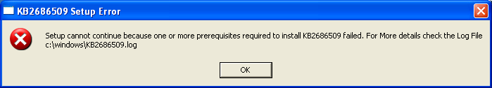 13.282: 2012/10/03 03:53:19.328 (local)13.328: C:\WINDOWS\SoftwareDistribution\Download\3438087687b5dd8accc81e44f72f02e7\update\update.exe (version 6.3.13.0)13.438: DoInstallation: GetProcAddress(InitializeCustomizationDLL) Returned: 0x7f 13.438: Failed To Enable SE_SHUTDOWN_PRIVILEGE13.469: Hotfix started with following command line: -q -z -er /ParentInfo:6a20991e19826d40ab0623d9725c4007 13.516: In Function GetReleaseSet, line 1240, RegQueryValueEx failed with error 0x217.000: Return Value From IsMachineSafe = 017.000: IsMachineSafe returned 44109217.000: Fist Condition in Prereq.IsMachineSafe.Section Failed17.000: Condition Check for Line 1 of PreRequisite returned FALSE 17.016: ReadStringFromInf: UpdSpGetLineText failed: 0xe000010217.016: KB2686509 Setup encountered an error: Setup cannot continue because one or more prerequisites required to install KB2686509 failed. For More details check the Log File c:\windows\KB2686509.log17.032: ReadStringFromInf: UpdSpGetLineText failed: 0xe000010217.032: Setup cannot continue because one or more prerequisites required to install KB2686509 failed. For More details check the Log File c:\windows\KB2686509.log17.032: Update.exe extended error code = 0xf0f4